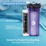 - PURA BIG STOP posee triple gradiente de filtración. Dicho en otras palabras, es como 3 tipos de filtrado en un solo filtro. Esto favorece al rendimiento, a su durabilidad en tiempo y en litros, además de su efectividad en la remoción de mayor cantidad de impurezas sólidas más finitas, tan pequeñas que hasta remueve partículas impercetibles al ojo humano.