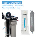 El Pack 2 Diamond es el kit de mantenimiento que se recambia cada 3 años en tiempo promedio, para tu Planta Purificadora hogareña Oibase. Está compuesto por 2 fases de tratamiento, la membrana PURA de ósmosis inversa y el pulidor remineralizador PURA Detox que le brinda el sabor mineral particular y tan agradable al agua de tu Planta Purificadora hogareña.