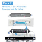 El Pack 2 Indico es el kit de mantenimiento que se recambia cada 2-3 años en tiempo promedio, para tu Purificador de 5 etapas PURA INDICO. Está compuesto por 2 fases de tratamiento, la membrana de Ultrafiltración PURA Ultramembrane y el pulidor remineralizador PURA Detox que le brinda el sabor mineral natural y tan agradable al agua de tu Purificador PURA Indico.