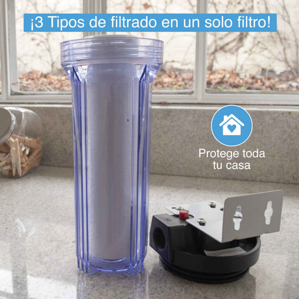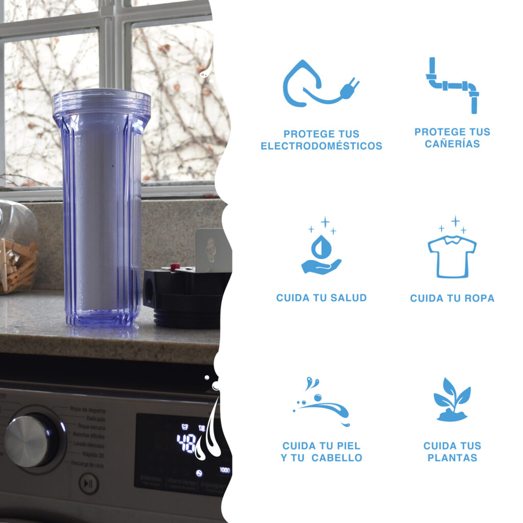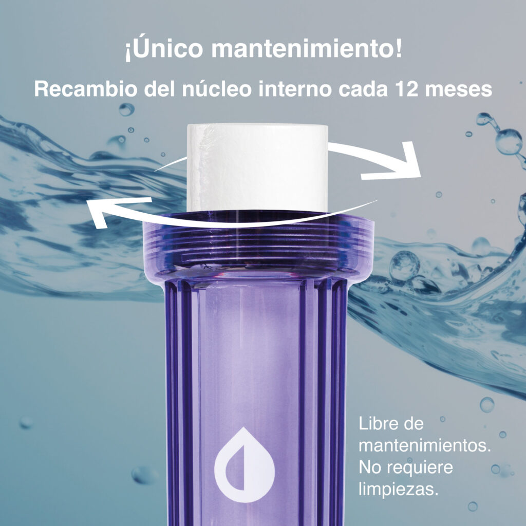 Purificador de alto rendimiento aplicado antes de la cisterna o electrodoméstico. Unico mantenimiento cambio de nucleo tipo cartucho anualmente.