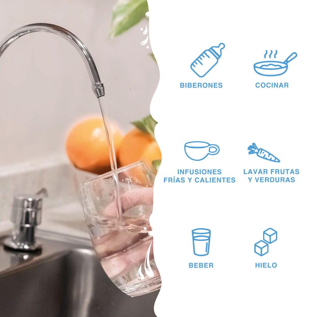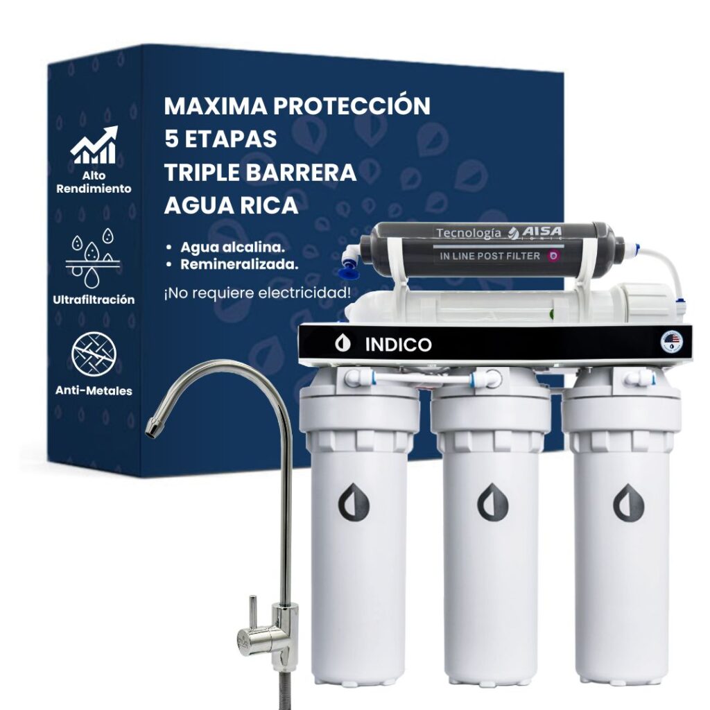 Filtro Purificador de Agua 5 etapas, con tecnología exclusiva que elimina Arsénico, incorpora Ultrafiltración, apto gastronomía, da cumplimiento a NOM, conexión bajo tarja, no requiere conexión eléctrica, agua premium, alcalina, agrega magnesio, equivalente al uso de 2mil bidones grandes. Mucho mejor, más segura y fácil que el bidon.