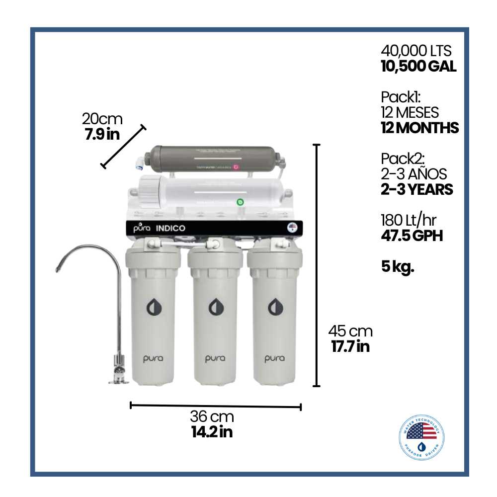 El Purificador de Agua PURA Indico es un avanzado sistema de purificación de agua en 5 etapas, diseñado para ofrecer agua pura y saludable tanto en hogares como en entornos gastronómicos. Asegura no solo agua limpia y segura para toda la familia sino que rica y con minerales que nuestro cuerpo necesita.